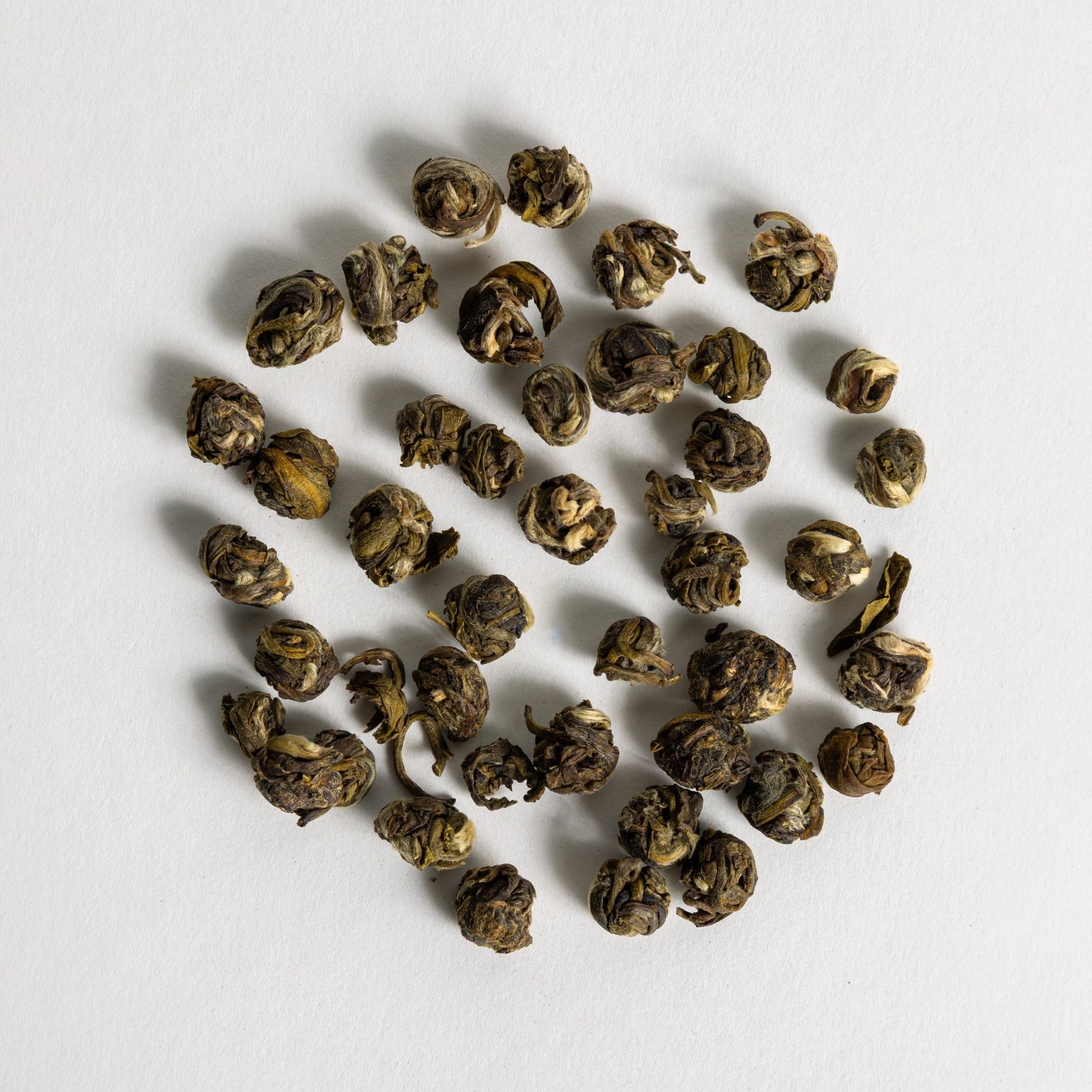 Silvery, fluffy green tea buds tied together into pearls. Produces a fresh, herbaceous and slightly floral flavor.